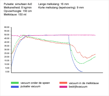 Daarna moet de melk naar boven worden afgevoerd waardoor er een kolom melk in de lange melkslang ontstaat en het vacuüm in de rust fase(d-fase) verder naar beneden gaat na ongeveer 15 kPa (zie bovenstaande grafiek).