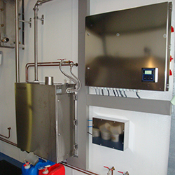 De reinigingsautomaat bestaat uit twee delen, het ene deel is de spoelbak geheel vervaardigd uit roestvrijstaal met daar in geïntegreerd drie waterventiel, twee reinigingsmiddelpompje en twee spoelkleppen. De spoelbakken zijn er met een inhoud van 100,150 en 200 ltr. Het derde waterventiel maak het mogelijk om de voorspoeling uit te voeren met freeheaterwater (indien aanwezig) zo niet dan kan warm en koud water gemengd worden en dit is in te programmeren. Ook kan er ingeprogameerd worden hoe vaak er per week met zuur of alkalisch reinigingsmiddel gespoeld wordt na het melken, ook de hoeveelheid reinigingsmiddel wordt op de juiste hoeveelheid ingeprogameerdt. Er zijn twee spoelkleppen één klep is aangebracht in de opzuigleiding en opent wanneer er water opgezogen moet worden, en de ander klep is een driewegklep en is in de retourleiding aangebracht en deze stuurt het retour water terug naar de spoelbak of naar de afvoer.