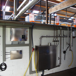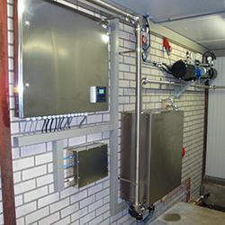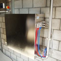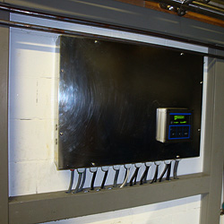 Het andere deel van de reinigings automaat is de schakelkast, in de kast bevind zicht de gehele besturing van de melkinstallatie geïntegreerd met de besturing van de reinigingsautomaat. De bediening van de reinigingsautomaat is zeer gebruiksvriendelijk, U maak Uw keuze door middel van de pijl toets en druk op start.